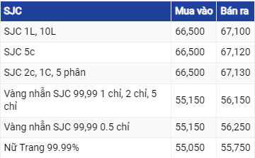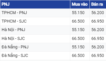 Giá vàng PNJ ở Hà Nội và TP Hồ Chí Minh được niêm yết ở mức 66,50 triệu đồng/lượng mua vào và 66,95 triệu đồng/lượng bán ra.