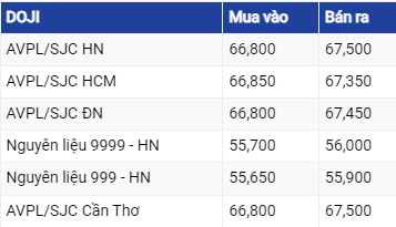 Cùng thời điểm giá vàng mua vào – bán ra được Tập đoàn DOJI niêm yết ở mức 66,8 - 67,5 triệu đồng/lượng.
