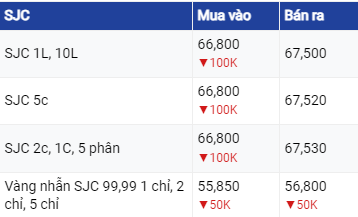 Cụ thể, tại Công ty Vàng bạc Đá quý Sài Gòn, giá vàng trong nước cuối phiên điều chỉnh giảm 100.000 đồng/lượng ở chiều mua vào và giữ nguyên ở chiều bán ra, niêm yết giá ở mức 66,8 triệu đồng/lượng mua vào; giá bán ra là 67,5 triệu đồng/lượng.