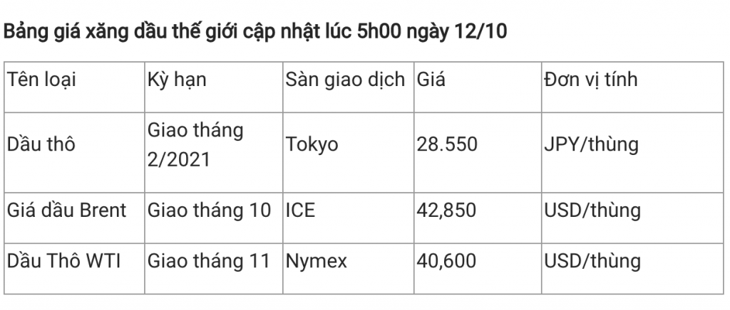 Ghi nhận vào lúc 5h (giờ Việt Nam) ngày 12/10, giá dầu thô ngọt nhẹ WTI của Mỹ ước tính đã tăng hơn 1% lên 40,60 USD/thùng, giá dầu thô Brent ước tính tăng hơn 1% lên 42,85 USD/thùng