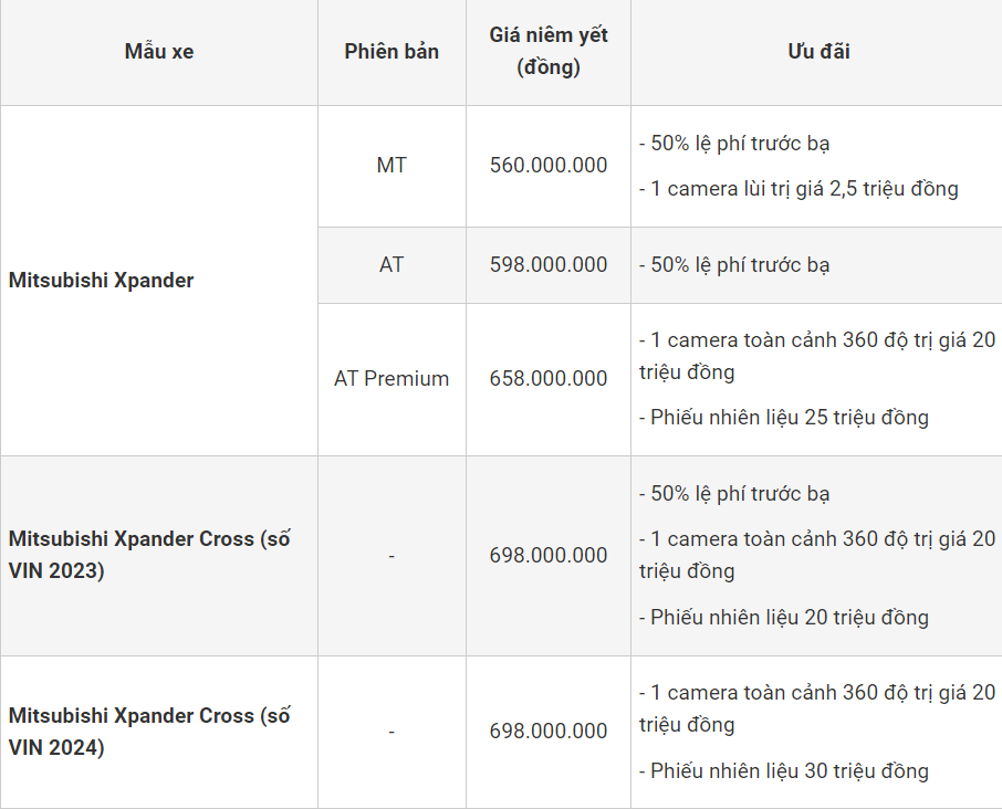 Với Xpander Cross, chương trình ưu đãi sẽ là 50% lệ phí trước bạ, camera 360 độ và phiếu nhiên liệu 20 triệu đồng cho xe sản xuất năm 2023 (số VIN 2023). Ưu đãi lệ phí trước bạ của mẫu xe này có giá trị khoảng 35 triệu đồng. Xe số VIN 2024 sẽ được tặng camera toàn cảnh 360 độ và phiếu nhiên liệu 30 triệu đồng.