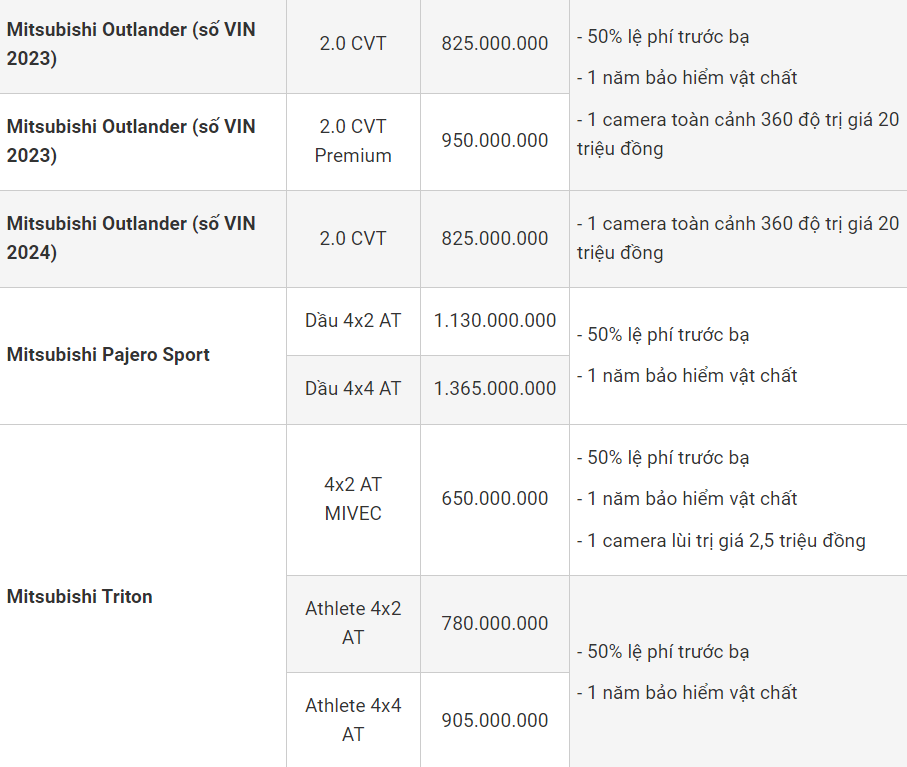 Trong khi đó, Mitsubishi Outlander được hỗ trợ 50% lệ phí trước bạ (tương đương 41 - 47 triệu đồng), 1 năm bảo hiểm vật chất và camera toàn cảnh 360 độ với xe số VIN 2023. Riêng Outlander bản 2.0 CVT số VIN 2024 sẽ chỉ được khuyến mãi camera 360 độ.