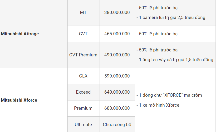 Với Xforce, hãng Mitsubishi hiện đang áp dụng giá bán đặc biệt, dao động từ 599 - 680 triệu đồng. Ngoài ra, hãng còn tặng 1 dòng chữ "XFORCE" mạ crôm và 1 xe mô hình Xforce cho khách hàng mua xe.