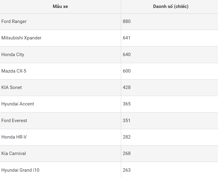 Top 10 xe ô tô bán chạy nhất tháng 2/2024