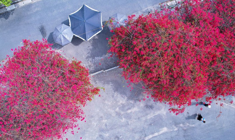 | Những suối hoa giấy đỏ rực tuôn chảy rực rỡ tạo sức hấp dẫn kỳ lạ. |