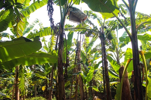 | Chuối ngự thân cao nhưng "gầy", yếu và giòn, nên người dân phải cắm cọc để chống cho cây không bị ngã đổ |