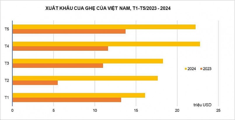 Theo số liệu thống kê của Hải quan Việt Nam, xuất khẩu cua ghẹ của Việt Nam tăng trưởng liên tục từ đầu năm 2024. Chỉ tính riêng trong tháng 5/2024, giá trị xuất khẩu tăng 62% so với cùng kỳ năm 2023, đạt 22 triệu USD. Tính lũy kế 5 tháng đầu năm, kim ngạch xuất khẩu đạt hơn 97 triệu USD, tăng 76%.