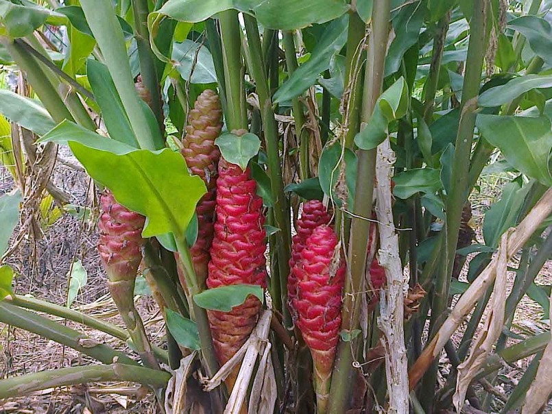 Cụm hoa mọc từ thân rễ, hình nón hoặc hình trứng thuôn dài, 6-15 × 3,5–5 cm, đỉnh tù; cuống cụm hoa 10–30 cm, bẹ hình vảy 5-7; lá bắc xếp lợp chặt, khi non màu xanh lục, khi già màu đỏ, hơi có lông, mặt gần trục nhớt, mép dạng màng; lá bắc con dài ~1,5 cm.