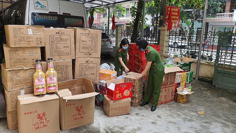 Cụ thể, ngày 6/7, qua nắm tình hình, Công an thành phố Hà Giang tiến hành kiểm tra, phát hiện xe ôtô Ford Transit mang BKS 23B-005.71 đang vận chuyển 8 bao tải, 64 thùng cát tông, bên trong có chứa các mặt hàng thực phẩm như: Chân gà muối, bim bim, mì tôm, nước giải khát, quả óc chó, táo đỏ… số hàng trên có nhãn mác thể hiện bằng chữ nước ngoài.