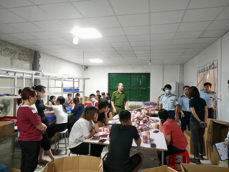 | Hàng chục nhân viên đang thực hiện đóng gói sản phẩm thuốc lá điện tử thì bị phát hiện. |