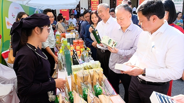 | Phó Chủ tịch Thường trực UBND TP Hà Nội Nguyễn Văn Sửu thăm các gian hàng trưng bày thực phẩm |