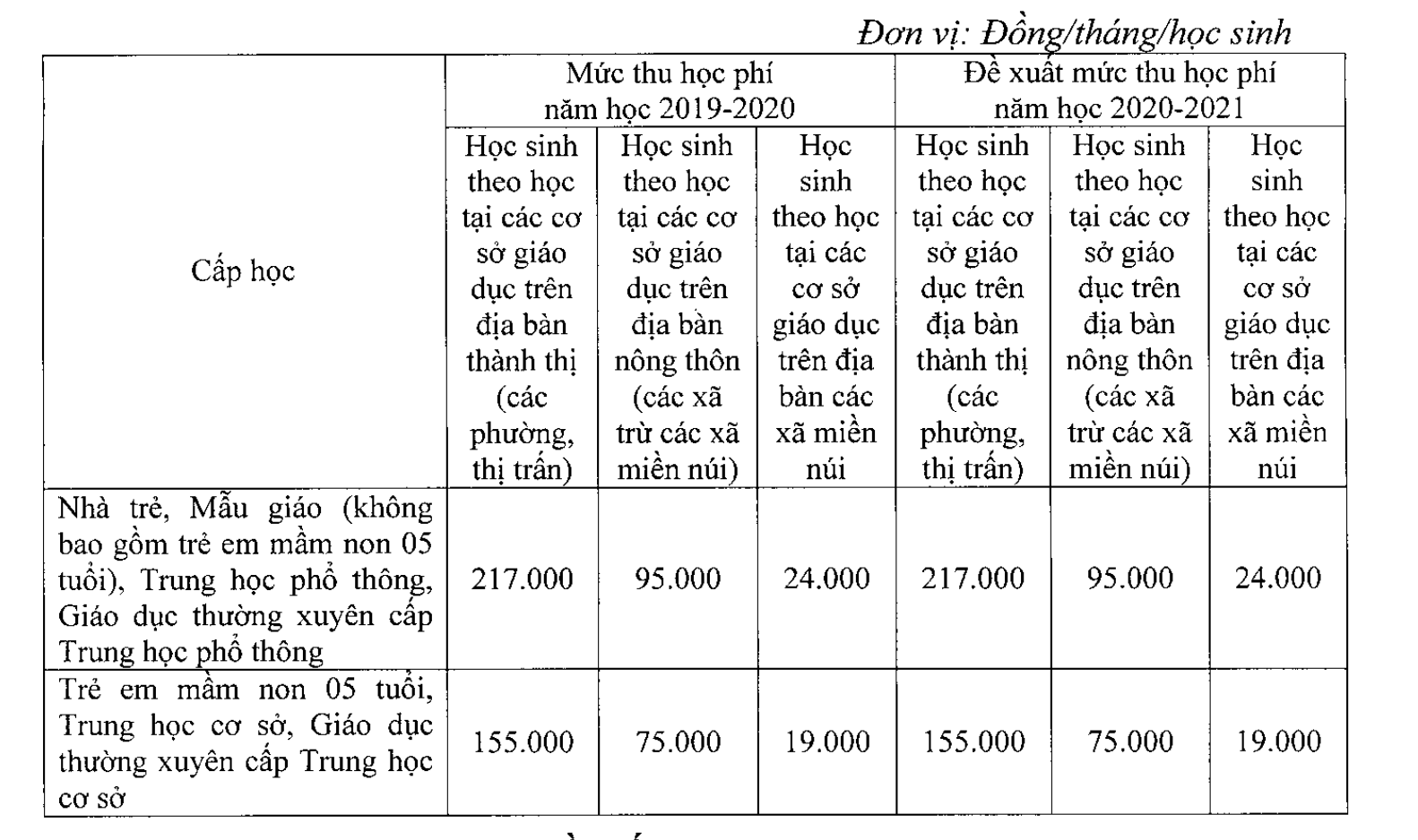 Về học phí giáo dục mầm non, giáo dục phổ thông công lập (trừ cơ sở giáo dục chất lượng cao), năm học 2019-2020, các cơ sở này thực hiện phu phí theo quy định tại Nghị quyết số 06/2019/NQ-HĐND. Cụ thể mức phí chia theo địa bàn, trong đó nhà trẻ, mẫu giáo, THPT, GDTX cấp THPT, mức thu với học sinh thành thị là 217.000 đồng/tháng, học sinh nông thôn 95.000 đồng, học sinh xã miền núi 24.000 đồng.