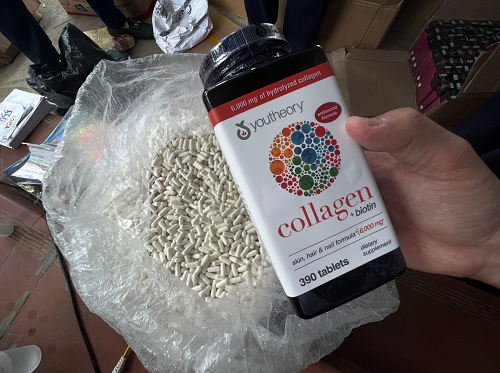 | Cận cảnh thực phẩm bảo vệ sức khỏe collagen biotin 390 viên được "ra lò" ở một căn nhà cấp 4 ẩm thấp ở ngoại thành Hà Nội. |