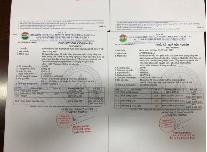 Mẫu kết quả kiểm nghiệm nước mắm có chưa chất tẩy rửa bồn cầu. Ảnh: VietQ