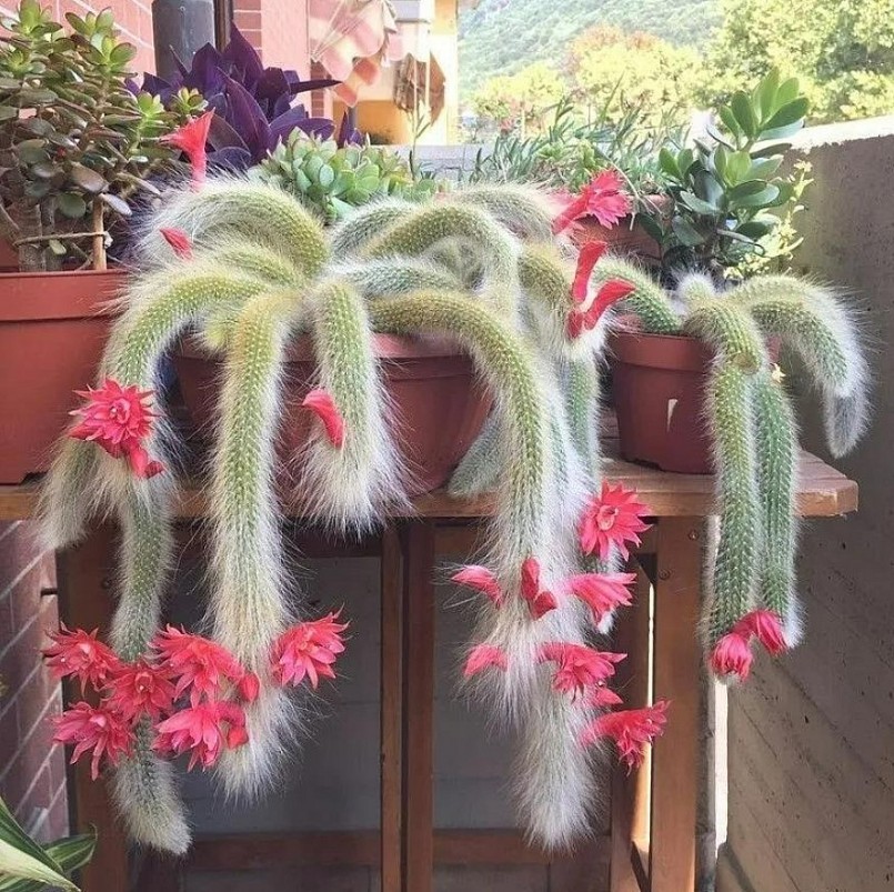 Loại xương rồng này có tên khoa học là Cleistocactus colademononis, có nguồn gốc từ Bolivia. Thân cây có hình trụ dài từ tới 2,5m và dày 3-5cm, nhiều lông tơ màu trắng dài, trông giống đuôi khỉ nên được gọi là xương rồng đuôi khỉ. Tuy nhiên, những chiếc lông này rất mềm, không gây ra bất kỳ tổn thương nào.