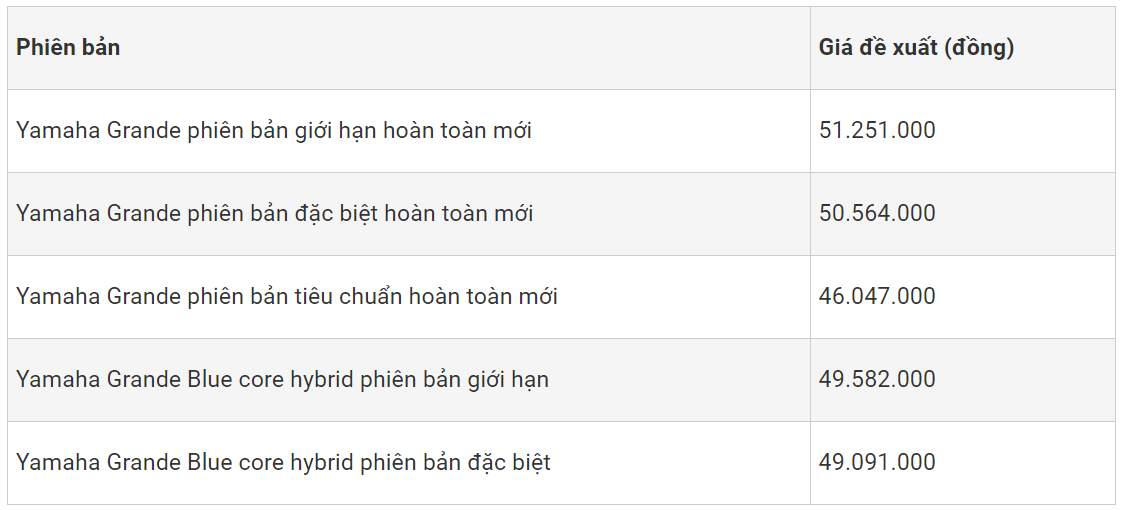 Thiết kế xe mang phong cách cổ điển châu Âu, trẻ trung, sang trọng, nữ tính với 2 phiên bản, bản cao cấp có màu xanh đen, màu trắng, nâu nhám, đen nhám; bản đặc biệt có màu xanh lơ, xanh lá, lam sẫm, kem, đỏ. Hiện tại, Yamaha Grande đang có 2 phiên bản: Yamaha Grande Premium có 4 màu: xanh đen, trắng, nâu nhám, đen nhám; Yamaha Grande Deluxe có 5 màu: xanh lơ, xanh lá, lam sẫm, kem, đỏ.