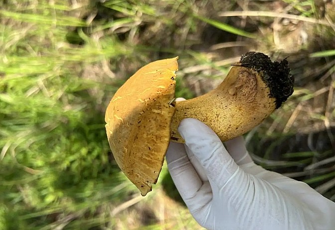 Găng tay y tế hoặc găng tay không bụi để bảo vệ tay khi tiếp xúc với các loại nấm hoặc cây rừng.