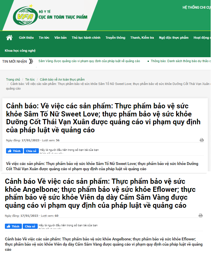 Theo Cục An toàn thực phẩm, trong thời gian vừa qua tại một số website/đường link có quảng cáo các sản phẩm thực phẩm bảo vệ sức khỏe vi phạm quy định của pháp luật về quảng cáo thực phẩm, quảng cáo mà không được cơ quan nhà nước có thẩm quyền xác nhận nội dung trước khi thực hiện quảng cáo.