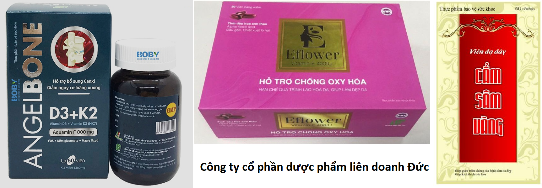 Thực phẩm bảo vệ sức khỏe Angelbone; thực phẩm bảo vệ sức khỏe Eflower; thực phẩm bảo vệ sức khỏe Viên dạ dày Cẩm Sâm Vàng do Công ty cổ phần dược phẩm Liên doanh Đức, địa chỉ: số nhà 7, ngạch 23/20, ngõ 23, phố Bồ Đề, quận Long Biên, Hà Nội công bố và chịu trách nhiệm về sản phẩm.