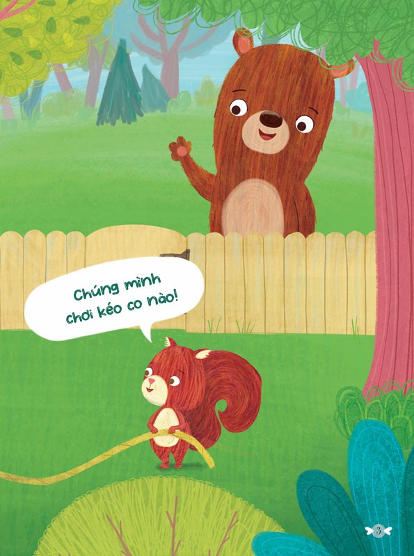 Thỏ, chuột và sóc đang chơi cùng nhau thì gấu đến xin tham gia. Vì cơ thể to lớn, gấu không thể chơi cùng như trước. Nhờ sự nhanh trí của thỏ, các bạn đã nghĩ ra trò chơi phù hợp để tất cả đều có thể cùng chơi vui vẻ. Câu chuyện giúp trẻ hiểu rằng chơi hòa đồng và biết nghĩ cho người khác sẽ khiến niềm vui trọn vẹn hơn.