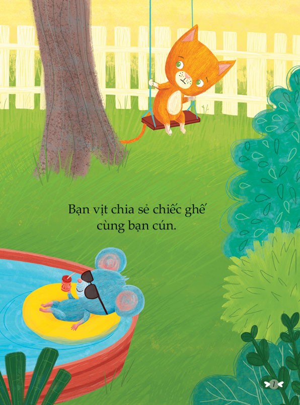 Các bạn động vật trong rừng đều biết chia sẻ với nhau: chuột chia sẻ với gấu, chó chia sẻ với chuột… Riêng mèo con lại muốn chơi một mình. Khi chó nhắc chơi một mình chẳng vui, mèo đã mời bạn cùng chơi bập bênh, rồi thêm nhiều bạn khác cùng tham gia. Mèo cũng nhận ra rằng chia sẻ mang đến niềm vui và kết nối tình bạn.