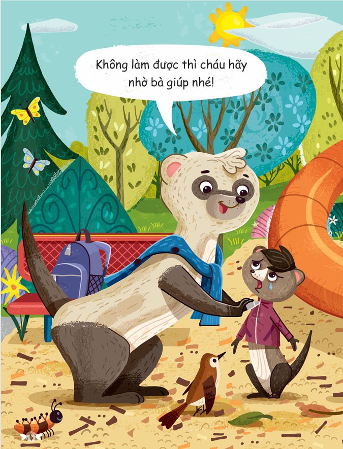 Bạn chồn nhỏ tên Kit cùng bà đi chơi ở khu vui chơi. Khi áo bị kẹt khóa, bà dạy Kit nếu không tự làm được thì hãy nhờ người khác giúp. Sau đó, khi bị mắc trong ống trượt, Kit nhớ lời bà, không còn hoảng sợ mà biết nhờ giúp đỡ. Từ đó, Kit không chỉ biết tự ứng phó khi gặp khó khăn mà còn biết giúp đỡ bạn khác. Câu chuyện giúp trẻ học được cách tìm kiếm sự giúp đỡ đúng lúc và biết quan tâm người xung quanh.