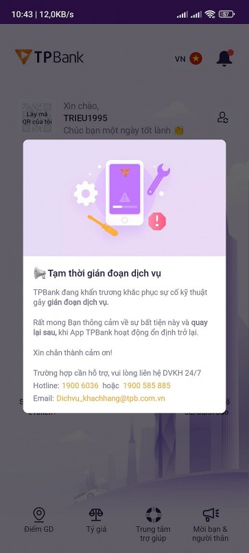 "TPBank đang nỗ lực tối đa để xử lý khắc phục nhanh nhất. TPBank rất mong quý khách thông cảm với những bất tiện về giao dịch có thể xảy ra trong khoảng thời gian này", nhà băng này cho biết.