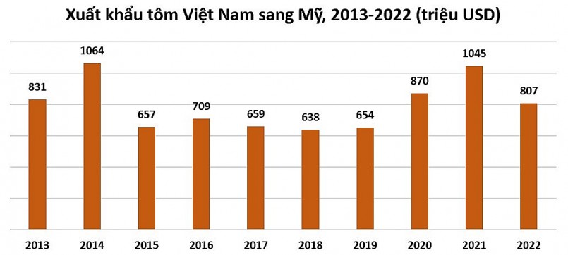 Trong 10 năm (2013-2022), kim ngạch xuất khẩu tôm Việt Nam sang Hoa Kỳ dao động từ 638 triệu USD- trên 1 tỷ USD. Trong giai đoạn 10 năm này, có hai năm xuất khẩu tôm sang Hoa Kỳ ghi nhận kim ngạch xuất khẩu trên 1 tỷ USD đó là vào năm 2014 và năm 2021.