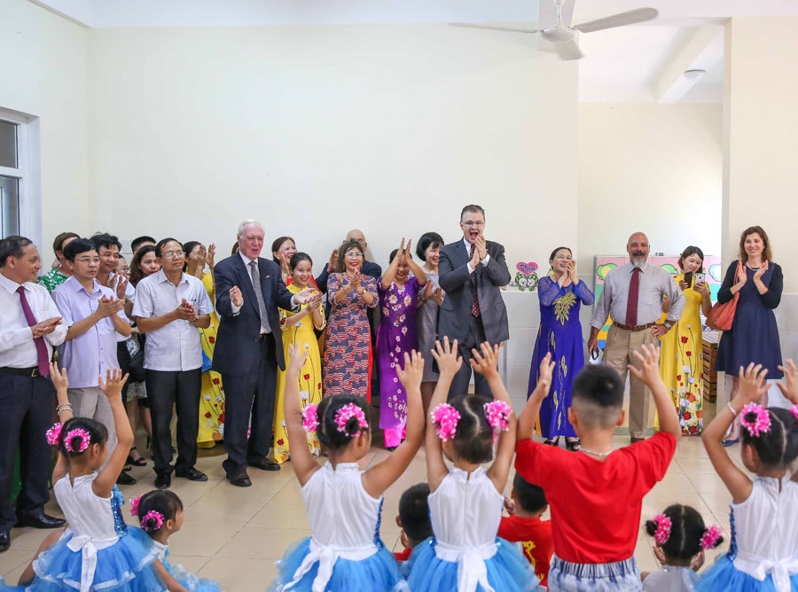 Đại sứ Daniel Kritenbrink, phái đoàn của Đại sứ quán và các cựu chiến binh Mỹ tới thăm Trường mầm non Quảng Trung được xây dựng