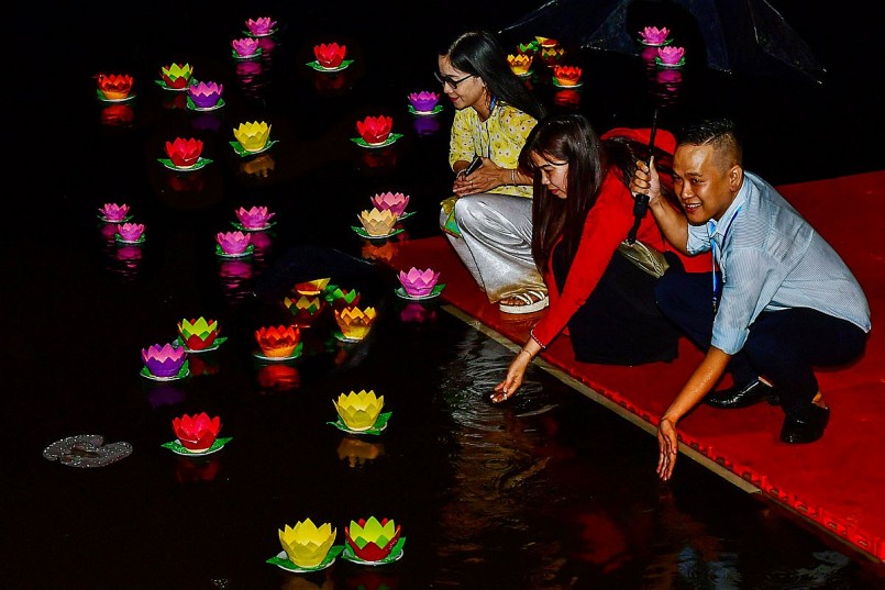| Những chiếc đèn hoa đăng được đại biểu và người dân thả xuống mặt nước Ao Bà Om tạo nên những hình ảnh lung linh, rực rỡ sắc màu, kèm theo ước vọng bình an, mùa màng tươi tốt. |