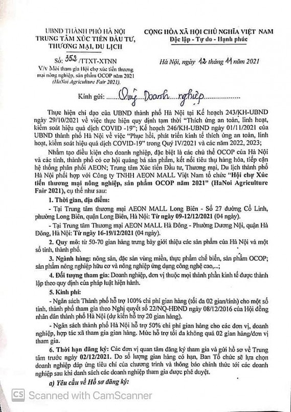Các doanh nghiệp, tổ chức đăng ký tham gia hội chợ gửi hồ sơ liên hệ tới Trung tâm Xúc tiến Đầu tư, Thương mại, Du lịch thành phố Hà Nội trước ngày 02/12/2021.