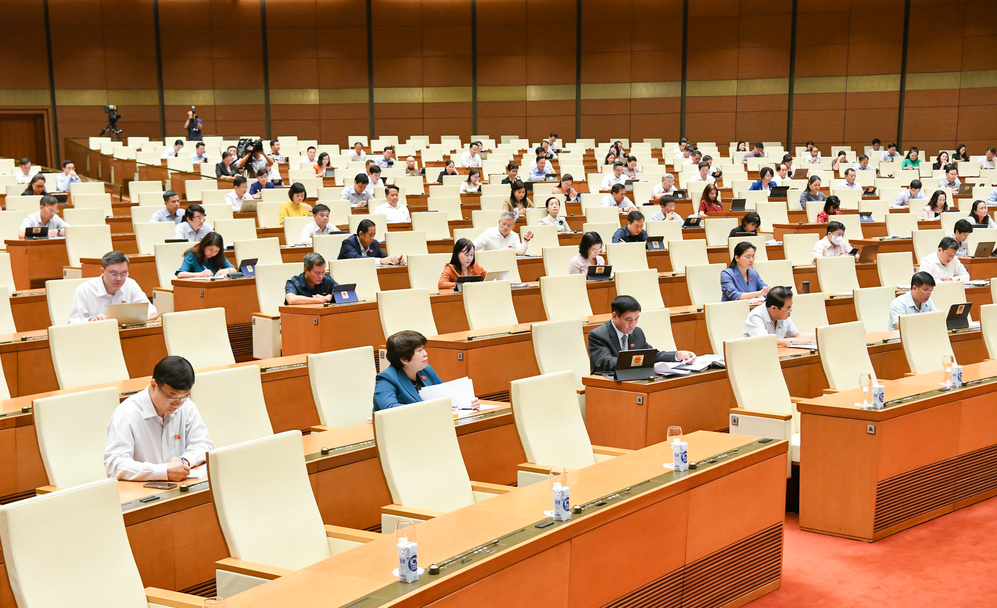 Về vai trò của chủ tọa, người được phân công điều hành phiên họp quy định về thảo luận, tranh luận chất vấn tại phiên họp toàn thể, đại biểu thống nhất với việc bổ sung quy định về phân công người trình bày dự án, dự thảo báo cáo trước Quốc hội trong trường hợp người đại diện của cơ quan, tổ chức, người có thẩm quyền trình không thể thuyết trình dự án, dự thảo.