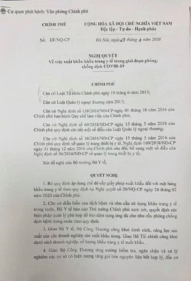 Cụ thể, Nghị quyết 60/NQ-CP Chính phủ quyết nghị bỏ quy định áp dụng chế độ cấp giấy phép xuất khẩu đối với mặt hàng khẩu trang y tế theo quy định tại Nghị quyết số 20/NQ-CP ngày 28/2/2020 của Chính phủ.