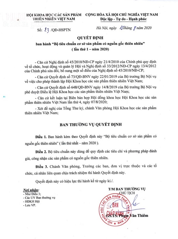 Hôm nay ngày 15/8/2020, GS.TS. Phạm Văn Thiêm - Chủ tịch Trung ương Hội Khoa học các sản phẩm thiên nhiên Việt Nam đã chính thức ký Quyết định ban hành “Bộ tiêu chuẩn cơ sở sản phẩm có nguồn gốc thiên nhiên” (lần thứ nhất - năm 2020).
