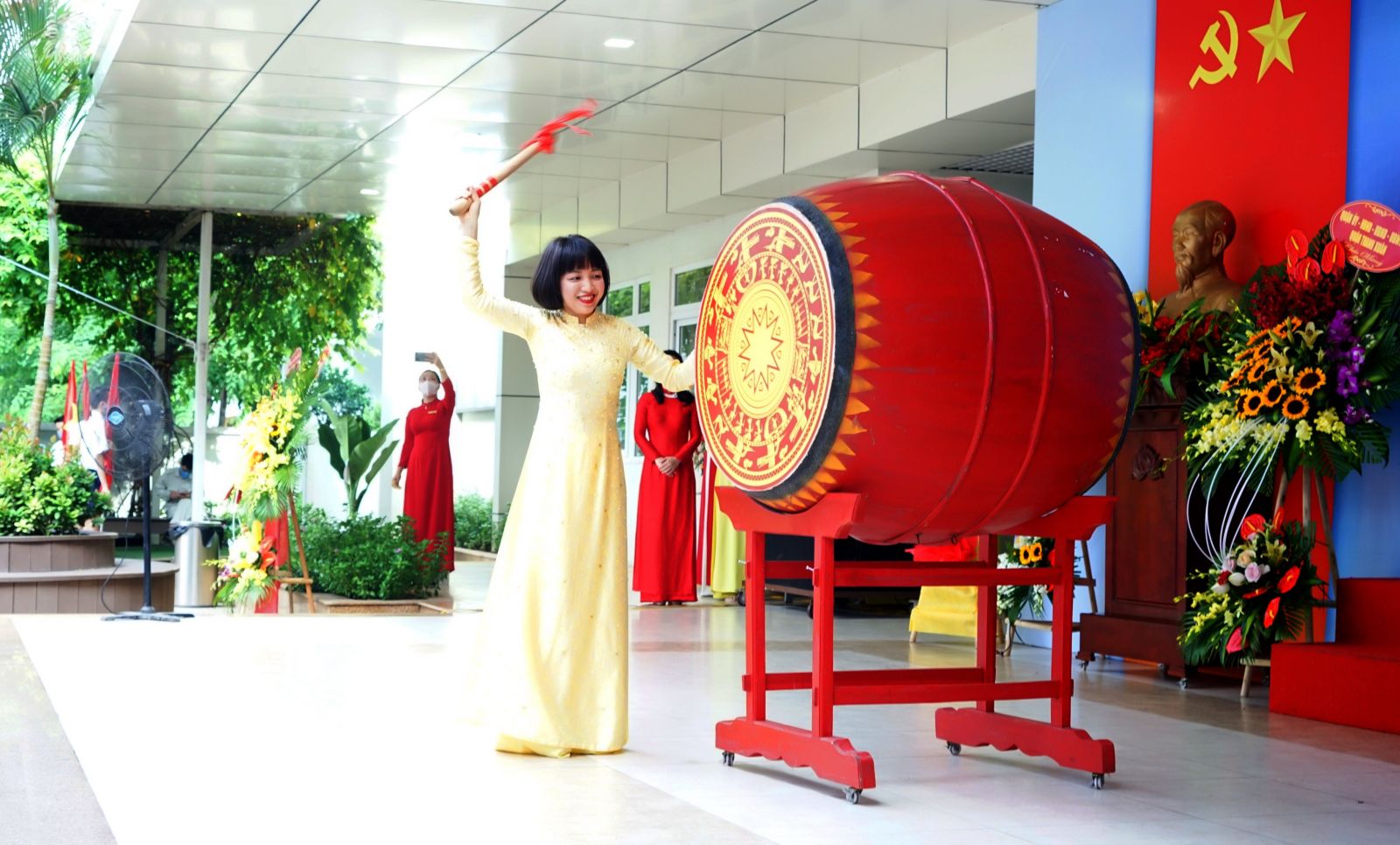 Cô giáo Ngô Thị Diệp Lan- Hiệu trưởng nhà trường đánh trống khai giảng năm học mới 2020- 2021