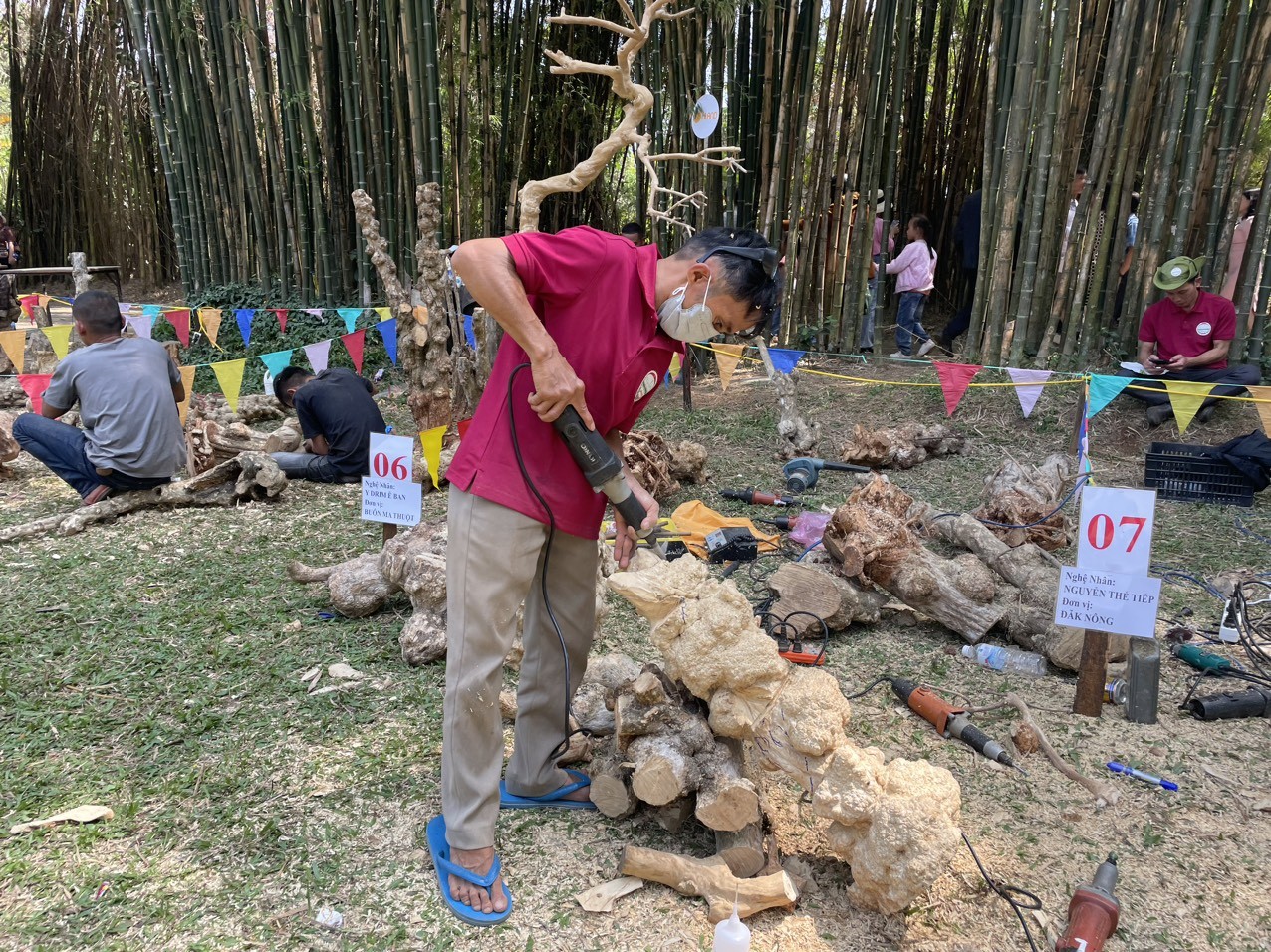 | Các nghệ nhân đang thi tài, tạo sản phẩm độc lạ từ gốc cà phê. |
