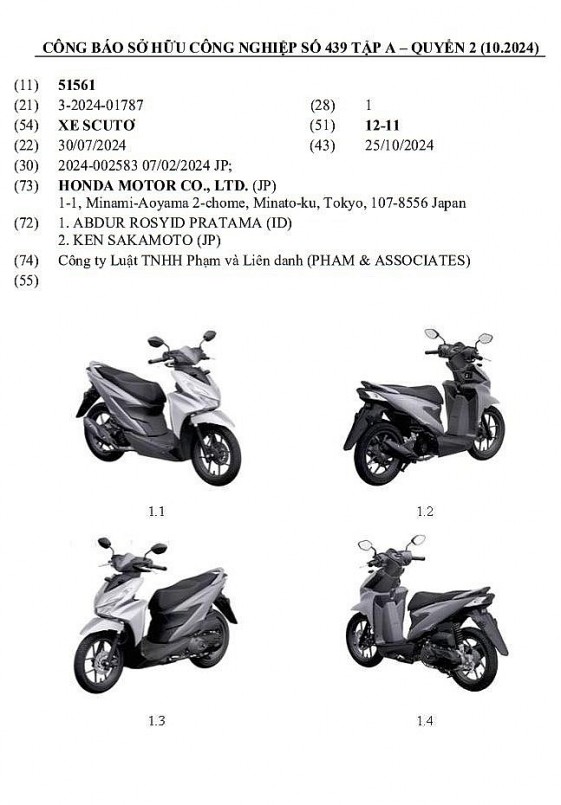 Cục Sở hữu trí tuệ Việt Nam vừa công bố loạt kiểu dáng công nghiệp mới được đăng ký trong tháng 10/2024. Đáng chú ý, trong số này xuất hiện một mẫu xe tay ga mới được đăng ký bản quyền bởi Công ty Honda Motor.