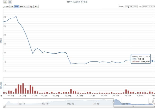 Theo tìm hiểu, HVC Group là doanh nghiệp hoạt động chính trong lĩnh vực tổng thầu khu vui chơi giải trí và tổng thầu M&E. HVC Group chào sàn HOSE vào cuối tháng 11 năm ngoái với 20 triệu cổ phiếu niêm yết, đóng cửa phiên đầu tiên ở 18.700 đồng/cổ phiếu và đạt mức đỉnh tại 28.500 đồng vào phiên 21/8/2019, nhưng bất ngờ sau đó đã gặp một đợt bán tháo mạnh và đẩy cổ phiếu này về vùng 20.000 đồng/cổ phiếu, và tiếp tục điều chỉnh về mức quanh 18.000 đồng thời gian gần đây.