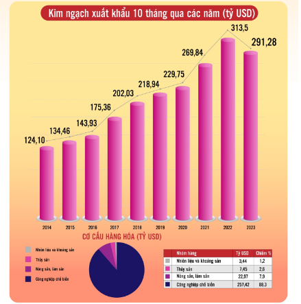 Trong 10 tháng năm 2023, có 33 mặt hàng đạt kim ngạch xuất khẩu trên 1 tỷ USD, chiếm 92,9% tổng kim ngạch xuất khẩu (có 07 mặt hàng xuất khẩu trên 10 tỷ USD, chiếm 66,2%). Về cơ cấu nhóm hàng xuất khẩu 10 tháng năm 2023, nhóm hàng nhiên liệu và khoáng sản ước đạt 3,44 tỷ USD, chiếm 1,2%; nhóm hàng công nghiệp chế biến ước đạt 257,42 tỷ USD, chiếm 88,3%; nhóm hàng nông sản, lâm sản ước đạt 22,97 tỷ USD, chiếm 7,9%; nhóm hàng thủy sản ước đạt 7,45 tỷ USD, chiếm 2,6%.