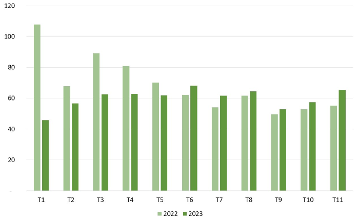 Theo số liệu thống kê sơ bộ của Tổng cục Hải quan, xuất khẩu sản phẩm mây, tre, cói và thảm trong tháng 11/2023 thu về hơn 65,3 triệu USD, tăng 13,8% so với tháng trước đó. Tính chung trong 11 tháng đầu năm 2023, nhóm hàng này đã thu về cho Việt Nam hơn 661,8 triệu USD, giảm 11,9% so với cùng kỳ năm 2022. Mức giảm so với năm 2022 đang dần thu hẹp qua mỗi tháng cho thấy sự khởi sắc trong xuất khẩu.