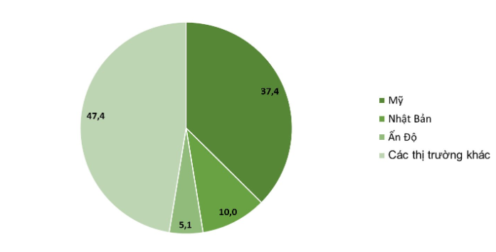 | Mỹ là thị trường xuất khẩu lớn nhất nhóm hàng mây, tre, cói và thảm của Việt Nam trong 11T/2023. (Đơn vị:%) |
