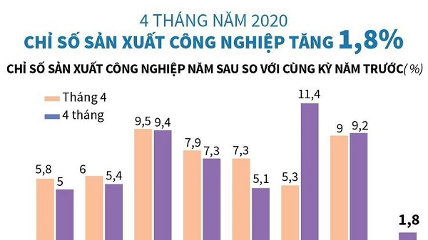 Tính chung 4 tháng đầu năm 2020 chỉ số sản xuất công nghiệp chỉ tăng 1,8%, là mức tăng thấp nhất trong nhiều năm qua nếu tính từ năm 2016 cho đến nay.