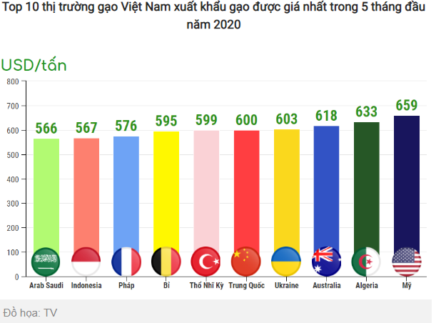 Theo thống kê của người viết về giá cả, Mỹ là thị trường Việt Nam xuất khẩu gạo được giá cao nhất khi đạt 658,9 USD/tấn; kế đến là Algeria đạt 633 USD/tấn; Australia đứng thứ ba đạt 618,3 USD/tấn.