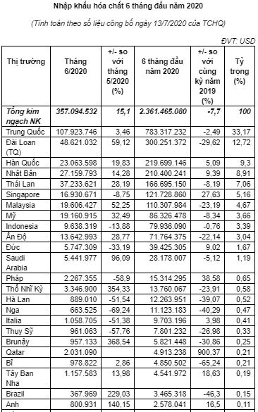 Tính riêng tháng 6/2020, nhập khẩu hóa chất tăng 15,1% về kim ngạch so với tháng trước đó nhưng giảm 10,4% so với tháng 6/2019, đạt gần 357,09 triệu USD.