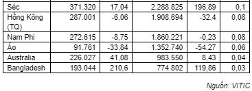 Ngược lại, các thị trường nhập khẩu sụt giảm mạnh về kim ngạch gồm có: Bỉ giảm 65,2%, đạt 4,85 triệu USD; Áo giảm 54,3%, đạt 1,35 triệu USD; Brazil giảm 46,3%, đạt 3,47 triệu USD.