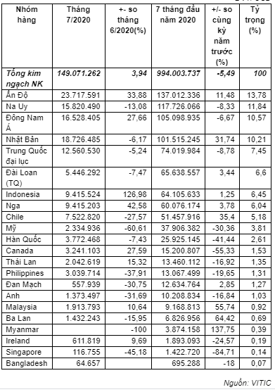 Ấn Độ, Na Uy, Đông Nam Á và Nhật Bản là Top các thị trường lớn cung cấp thủy sản cho Việt Nam, với kim ngạch trên 100 triệu USD/1 thị trường; trong đó nhập khẩu từ Ấn Độ đạt 137,01 triệu USD, tăng 11,5% so với cùng kỳ năm trước, chiếm 13,8% trong tổng kim ngạch nhập khẩu thủy sản của cả nước; riêng tháng 7/2020 nhập khẩu từ thị trường này tăng mạnh 33,9% so với tháng 6/2020 và cũng tăng mạnh 61,9% so với cùng tháng năm 2019, đạt 23,72 triệu USD.
