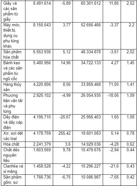 Cụ thể, trong 7 tháng Việt Nam chỉ thu về 2,39 tỷ USD, giảm nhẹ 6,4% so với cùng kỳ năm ngoái. Trong đó, có 4 mặt hàng đạt trị giá trăm triệu USD, chiếm tỷ trọng cao nhất (5,35% - 19,86%) trong tổng kim ngạch xuất khẩu và đều sụt giảm so với cùng kỳ.