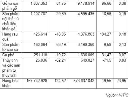 Tính đến tháng 7/2020, hàng rau quả có kim ngạch tăng mạnh nhất (+194,27%) so với cùng kỳ, đạt 4,38 triệu USD. Kế đến là mặt hàng gỗ và sản phẩm gỗ (+96,66%), đạt 9,18 triệu USD; Hàng thủy sản (+71,05%) đạt 33,86 triệu USD.