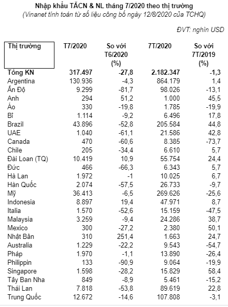 Tính chung, trong 7 tháng đầu năm 2020 Việt Nam đã chi hơn 2,1 tỉ USD nhập khẩu TĂCN & NL, giảm nhẹ 1,32% so với cùng kỳ năm 2019. Các thị trường có kim ngạch tăng trưởng mạnh trong thời gian này là: Singapore với 15 triệu USD, tăng 58,41% so với cùng kỳ năm 2019, Mexico với 2,3 triệu USD, tăng 50,1% so với cùng kỳ năm 2019, Anh với hơn 1 triệu USD tăng 45,48% so với cùng kỳ năm 2019, sau cùng là Brazil với hơn 205 triệu USD, tăng 44,84% so với cùng kỳ.