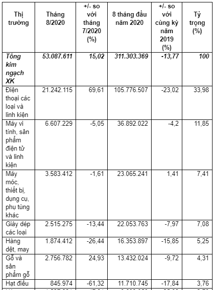 Tuy nhiên, lũy kế 8 tháng đầu năm 2020 xuất khẩu sang thị trường này vẫn sụt giảm 13,8% so với cùng kỳ năm 2019, đạt 311,3 triệu USD.
